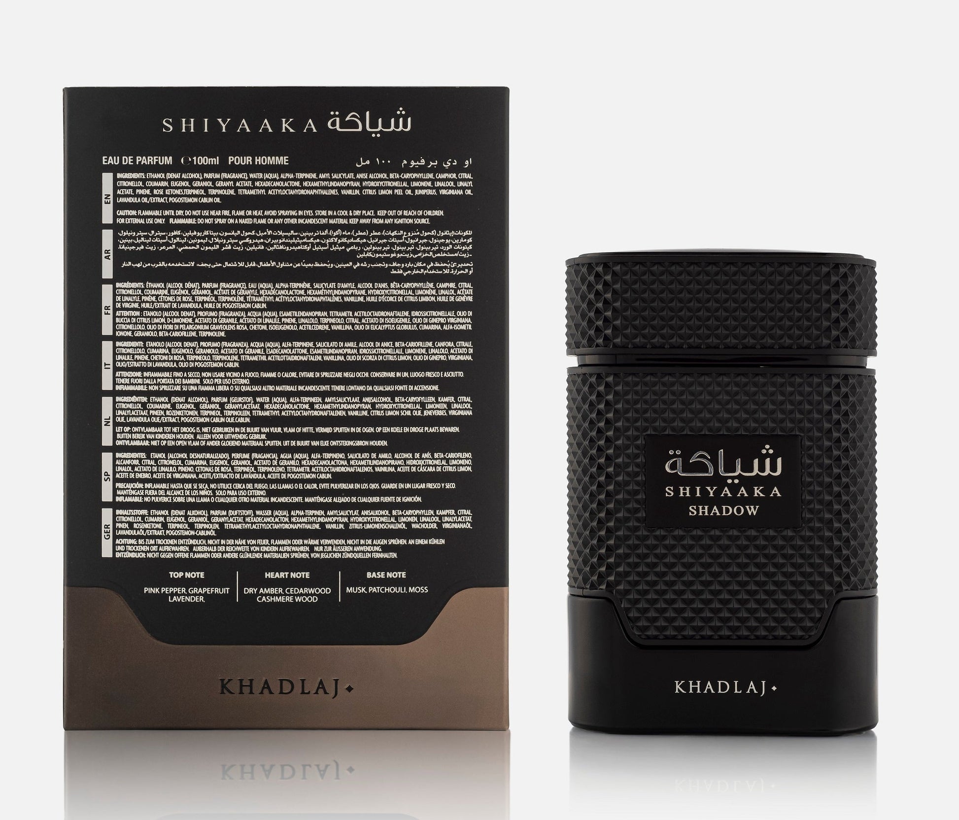 Khadlaj Shiyaaka Shadow is an oriental-spicy fragrance for men built around woods, musk, and amber. It opens with fresh, spicy citrus: grapefruit, pink pepper, and lavender, moves into a heart of dry amber, cashmere wood, and cedarwood, and settles in a base of patchouli, moss, and musk.
